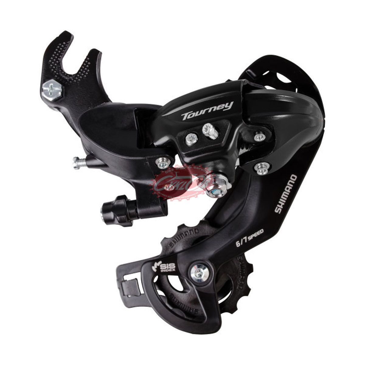 Základný model horskej prehadzovačky TY300 s kapacitou až 43 zubov a montážou na hák poskytuje vďaka technológii HYPERDRIVE ľahké a presné radenie na kazetových pastorkoch.